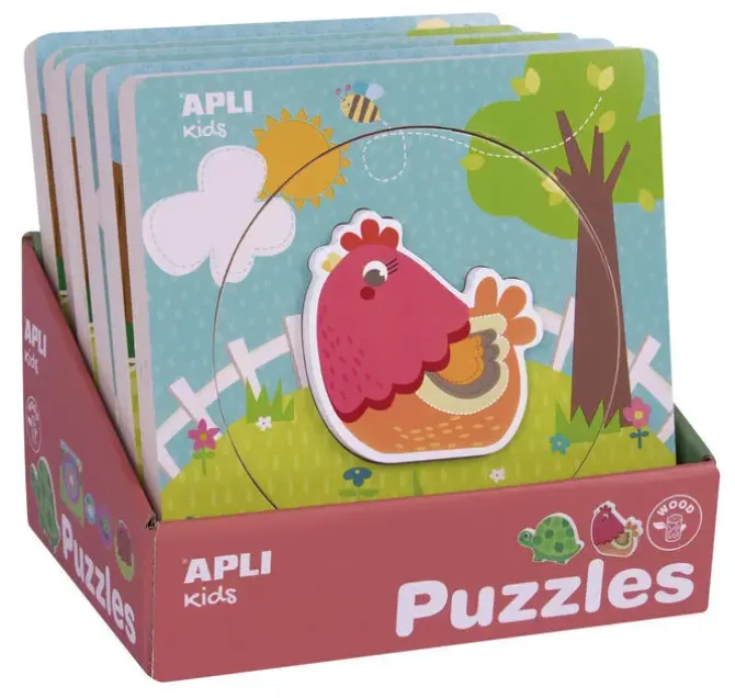 – Incluye 6 puzles tamaño 198 x 198 x 18 mm, con 2 modelos distintos: gallina y tortuga (3 unidades por modelo).