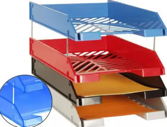 Bandeja con fondo liso. Posibilidad de utilizar varillas elevadoras metálicas que aumentan su capacidad facilitando el acceso a los documentos. Con hendidura frontal para un fácil acceso. Para documentos formatos Din A4 y folio. Color cristal. Medidas: 340 x 260 x 60 mm.