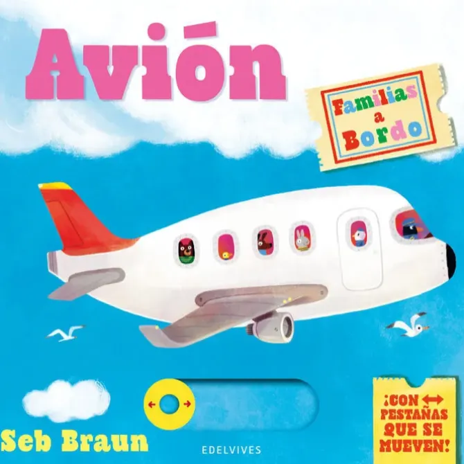 Sube a bordo de este avión y disfruta despegando, mirando el cielo y viéndolo aterrizar gracias a sus pestañas móviles. ¡Fiuuu, fiuuu!