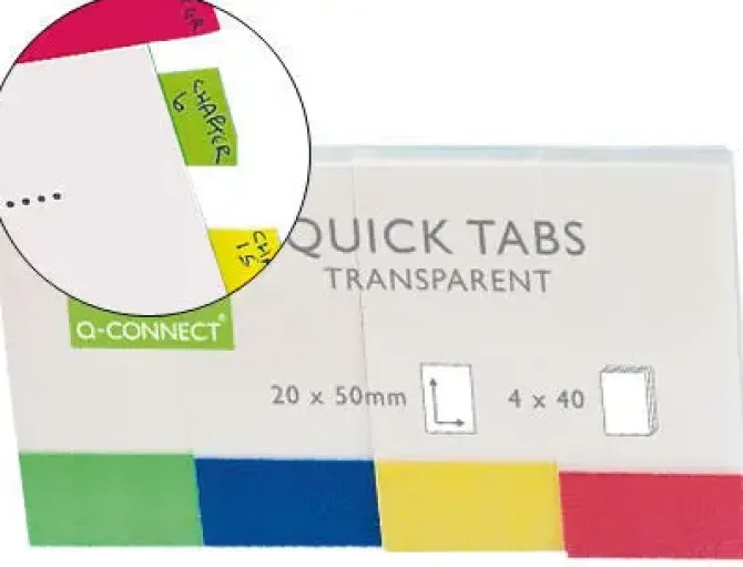 BANDERITAS SEPARADORAS Q-CONNECT 25X45 MM TRANSPARENTES Y COLOR PACK DE 4 CON 40 HOJAS