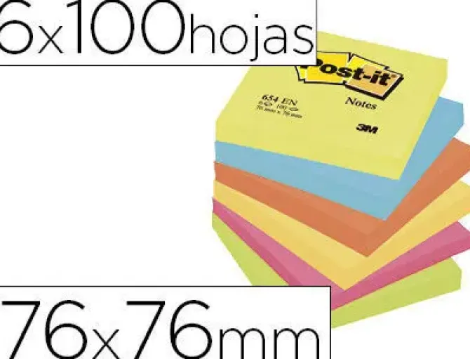 BLOC DE NOTAS ADHESIVAS QUITA Y PON POST-IT 76X76 MM NEON PACK DE 6 BLOCS SURTIDO