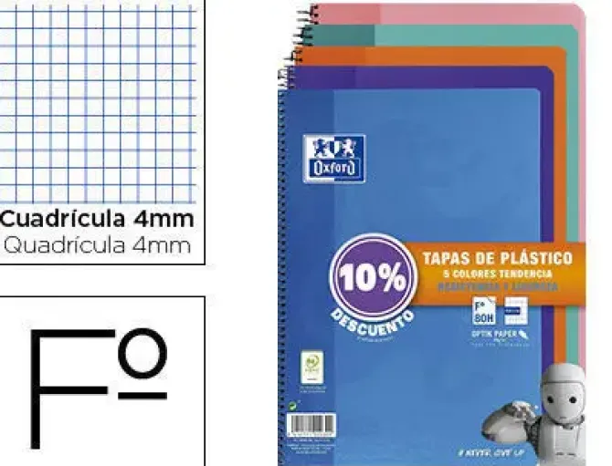 CUADERNO ESPIRAL OXFORD TAPA PLASTICO FOLIO 80 HOJAS CUADRO 4 MM PACK 5 UNIDADES COLORES TENDECIAS