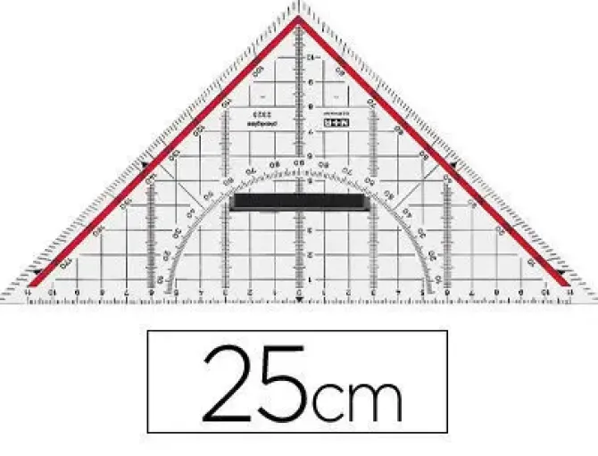 Escuadra de dibujo técnico de plexiglás transparente de alta calidad, con agujero para la aguja del compás en el cero de la escala. Escala opuesta de color rojo, división angular 180° – 1º línea 45°. Señalización de los ángulos 7°, 42°, 75°, escala en milímetros para el trazado de líneas paralelas, canto para tinta china con agarradera. Medidas de la hipotenusa: 25 cm.