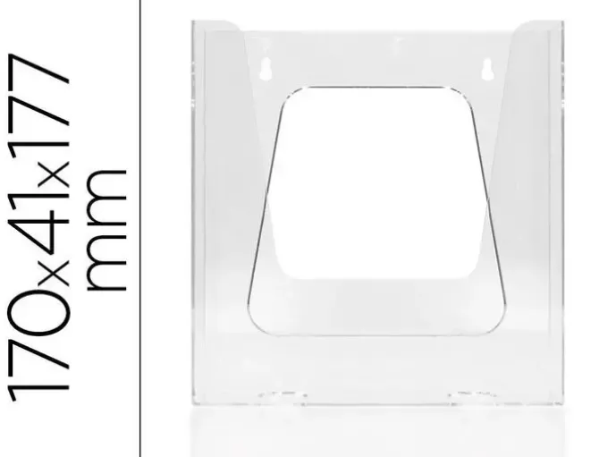 Expositor de metacrilato de gran resistencia para folletos y otros documentos. Posición vertical. Un compartimento. Su color transparente cristal asegura una atractiva presentación y una fácil localización del contenido. Con agujeros traseros para facilitar su colocación en la pared. Formato A5.Medidas: 170x41x177mm.