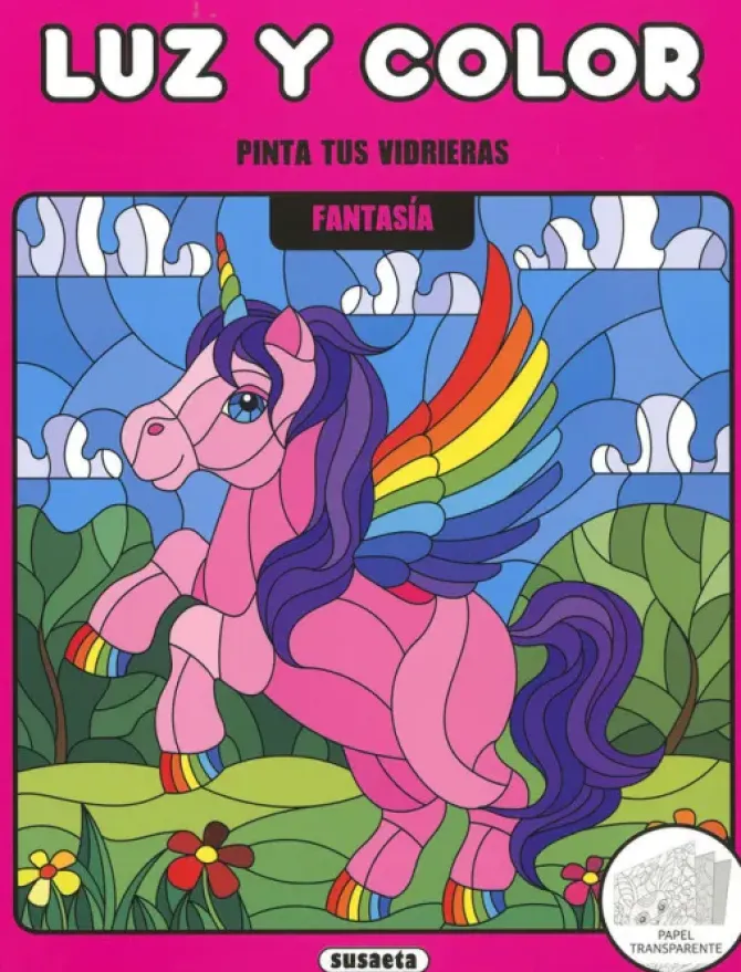 Decora tus ventanas con luminosas ilustraciones coloreando estas láminas de papel transparente que dejan pasar la luz. Sus dibujos de fantasía, compuestos de diferentes piezas para poder darles distintos tonos e intensidades, brillarán en el cristal como si fuera una original vidriera. Un libro que a los niños les encantará colorear.