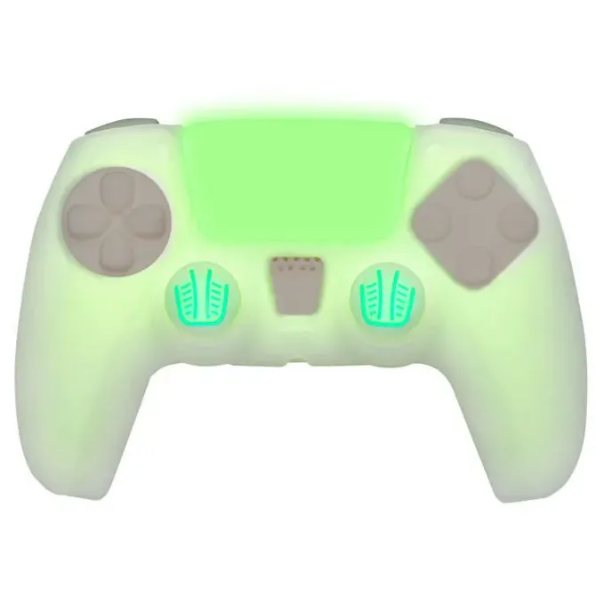 FR-TEC FUNDA DE SILICONA + GRIPS PROTECTORES CUSTOM KIT GLOW IN THE DARK PARA PS5 – GRIPS PROTECTORES – MEJORA EL AGARRE – STICKER PARA TOUCHPAD – BRILLA EN LA OSCURIDAD – COLOR VERDE