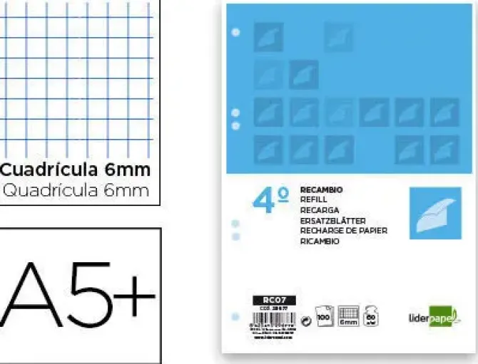 LIDERPAPEL RECAMBIO 4º CUARTO 4 Y 6 TALADROS 100 HOJAS CUADRICULA 6 MM CON MARGEN RC10 CS29677