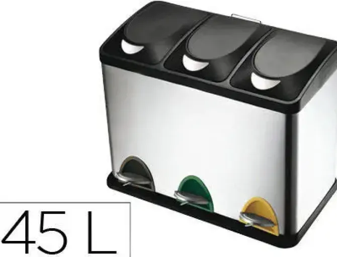 PAPELERA CONTENEDOR Q-CONNECT METALICA CON TAPADERA DE PLASTICO Y PEDAL 3 DEPOSITOS 45L 605X340X485 MM