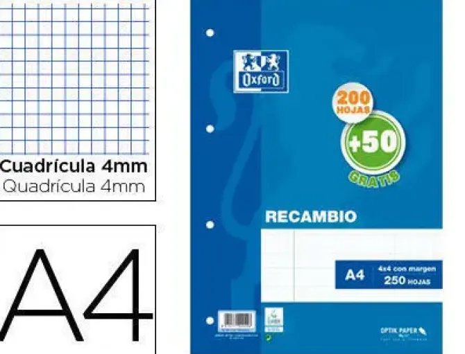 RECAMBIO OXFORD DIN A4 200 + 50 HOJAS GRATIS CUADRO 4 MM CON CS154780