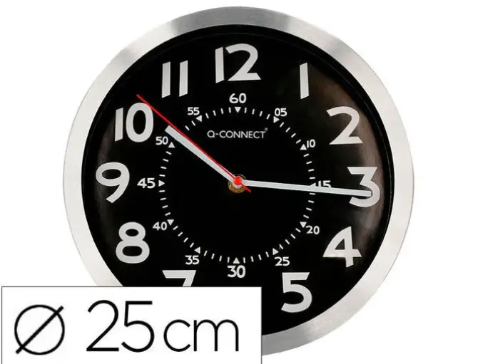 RELOJ Q-CONNECT DE PARED METALICO REDONDO 25 CM MOVIMIENTO SILENCIOSO COLOR CROMADO CON ESFERA NEGRA