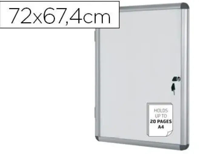 Vitrina de anuncios acristalada con marco de aluminio y superficie magnética de acero lacado en blanco. Cristal acrílico de alta transparencia que aporta gran visibilidad. Cantoneras redondeadas. Para utilizar con imanes y con rotuladores de borrado en seco. Incluye kit de fijación fácil. Cerradura con 2 llaves incluidas. Muy resistente, segura y ligera, con 3,5 cm de espesor.
