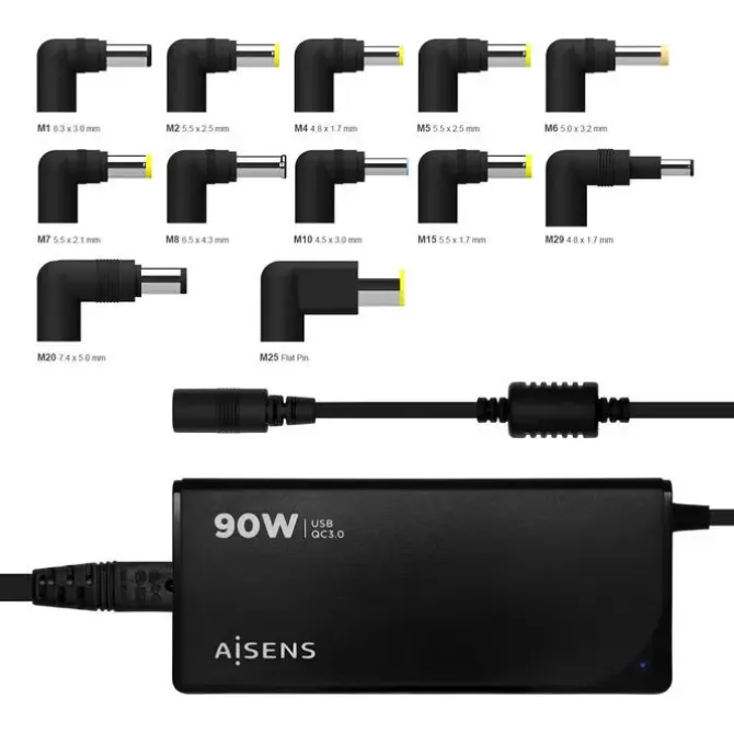 -Cargador 90W automático universal con 12 conectores y USB QC3.0 para cargar portátiles, móviles, cámaras y tablets etc. Diseño muy elegante, moderno y práctico.