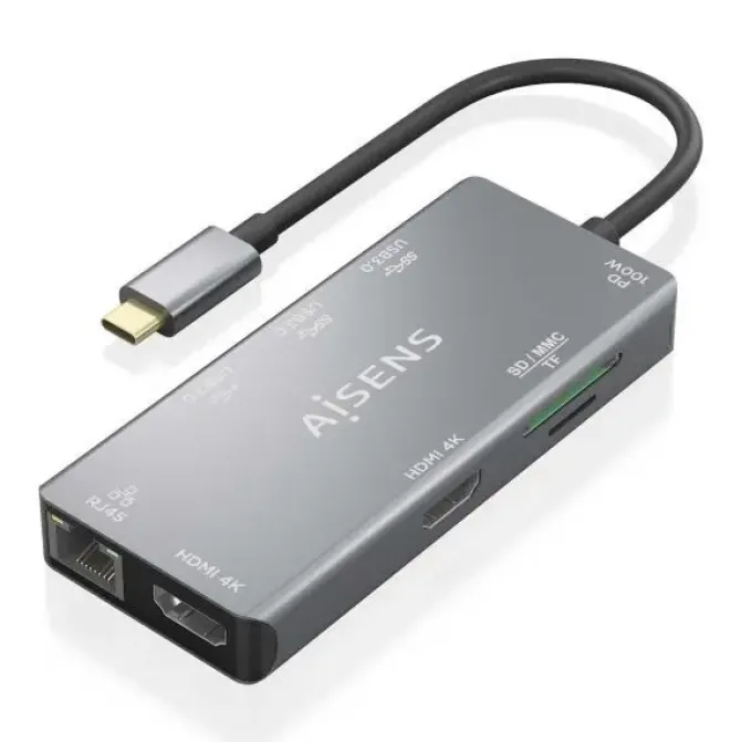 El adaptador también incluye dos puertos USB 3.0 con velocidades de hasta 5 Gbps, un puerto USB 2.0, y un puerto USB-C dedicado exclusivamente a la carga con soporte para USB PD 100W. Para almacenamiento, ofrece ranuras para tarjetas SD y TF, ambas con velocidades de lectura de hasta 5 Gbps. Con un diseño compacto de 15 cm de longitud y acabado en color gris, este dispositivo cumple con las normativas RoHS y CE, y ha sido 100% testeado para asegurar su funcionamiento. El paquete incluye el adaptador y un manual de usuario en varios idiomas.