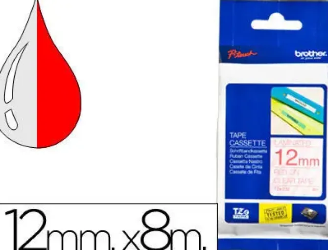 BROTHER TZE132 CINTA LAMINADA ORIGINAL DE ETIQUETAS - TEXTO ROJO SOBRE FONDO TRANSPARENTE - ANCHO 12MM X 8 METROS