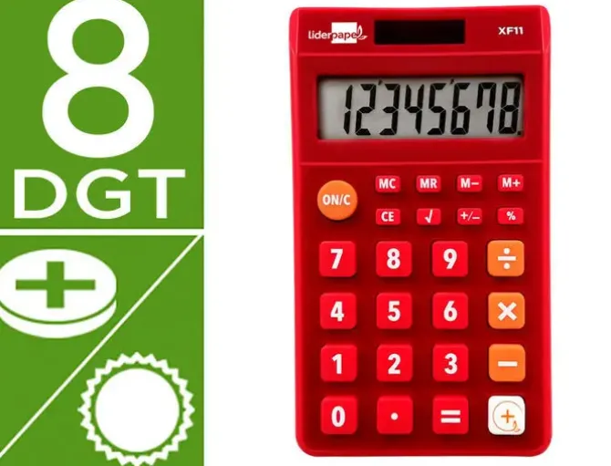 CALCULADORA LIDERPAPEL BOLSILLO XF11 8 DIGITOS SOLAR Y PILAS COLOR ROJO 115X65X8 MM