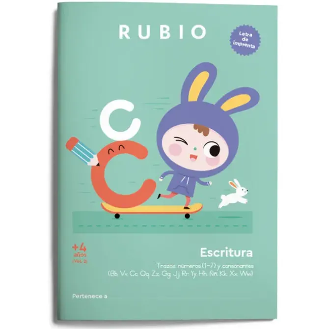 La colección Escritura con Letra de Imprenta RUBIO favorece, desde la etapa de infantil, el desarrollo de habilidades grafomotrices y de escritura atendiendo al nivel madurativo y evolutivo propio de cada edad. Los cuadernos presentan una secuencia progresiva de los contenidos, tanto en el grafismo (del trazo a la frase pasando por las letras, sílabas y palabras) como en la presentación de las letras (se presentan primero las de mayor uso en español). En Escritura con letra de imprenta (+4 años). Vol. 2 se trabajan las siguientes áreas: Grafomotricidad: ejercicios de trazos preparatorios para la escritura (rectos, curvos, alternos…) y actividades lúdicas de destreza manual y coordinación visomotora (despegar pegatinas, rasgar o recortar papel, rellenar siluetas, colorear). Actividades de conciencia fonológica, discriminación visual y atención: favorecen el reconocimiento fonético y gráfico de las letras, fundamental para la lectoescritura. Aprendizaje y trazado de letras: consonantes con variantes y consonantes menos frecuentes (Bb, Vv, Cc, Qq, Zz, Gg, Jj, Rr, Yy, Hh, Ññ, Kk, Xx, Ww). Autoevaluación: al fi