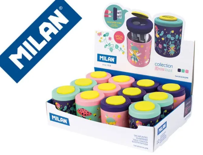 Expositor de sacapuntas doble (uno estándar y otro MAXI) con depósito. Diseño COLLECTION, edición especial FAIRY TALE. Cómodo tapón con rosca. El sacapuntas tiene una cuchilla de acero al carbono afilada y resistente, ideal para todo tipo de lápices. Artículo con cuchilla de seguridad. Este sistema evita que se pueda separar la hoja del cuerpo del sacapuntas, siendo óptimo para uso escolar. Colores surtidos disponibles: violeta, verde y rosa. Diseño original creado por el departamento de I+D de MILAN