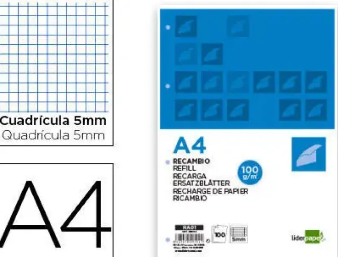 LIDERPAPEL RECAMBIO LIDERPAPEL A4 100 HOJAS 100G/M2 CUADRO 5MM CON MARGEN 4 TALADROS CS29104