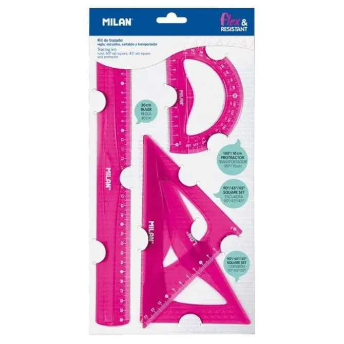 -Regla de 30 cm., escuadra 90º/45º/45º, cartabón 90º/60º/30º y transportador 180º 10 cm.