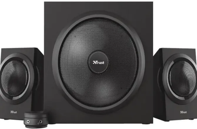 No hay duda de que el juego de altavoces Yuri 2.1 con subwoofer de Trust llama la atención. Su diseño compacto y elegante se presenta en un refinado color negro, con subwoofer de madera. Su tamaño reducido permite que se adapte a cualquier equipo, ya sea en la sala de estar o en el despacho de casa.